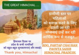 उप-मुख्यमंत्री मुकेश अग्निहोत्री ने नाहन के ऐतिहासिक चैगान मैदान में जिला स्तरीय हिमाचल दिवस समारोह के अवसर पर ध्वजारोहण के उपरांत जनसमूह को संबोधित करते हुए कहा कि हमारी सरकार, वायदे को पूरा करते हुए 2.31 लाख महिलाओं को प्रतिमाह 1500 रुपये पेंशन प्रदान करेगी। उन्होंने कहा कि हमारी सरकार पारदर्शिता सुनिश्चित करते हुए भ्रष्टाचार मुक्त एवं जवाबदेह प्रशासन प्रदान करने के लिए प्रतिबद्ध हैं।