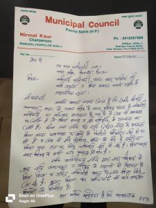 इस बारे में जानकारी देते हुए नगर परिषद अध्यक्षा निर्मल कौर ने बताया कि नगर परिषद ईओ बिना बताए छुट्टी पर चली जाती है जिसके कारण विकास कार्य बाधित हो रहे हैं मंथली मीटिंग्स भी नहीं हो पा रही हैं। उन्होंने कहा जब से कार्यकारी अधिकारी मैडम आए हैं तब से जो मंथली मीटिंग्स रखी जानी थी वह भी नहीं रखी गई है। उन्होंने कहा कि तो मैडम का काम नियमों के विरुद्ध है जिसके कारण पांवटा साहिब के विकास कार्य थम गए हैं। इस दौरान निर्मल कौर की अध्यक्षता में वाइस चेयरमैन ओपी कटारिया, पार्षद दीपक मल्हंस, दीपा शर्मा, मीनू गुप्ता, ममता सैनी, राजेंद्र सिंह आदि पार्षद मौके पर मौजूद रहे उन्होंने एसडीएम गुजींत चीमा को मामले की जांच करने व कार्रवाई करने के लिए पत्र सौंपा व नगर परिषद की बैठकों के आयोजन के लिए कोई रास्ता निकालने की बात कही।