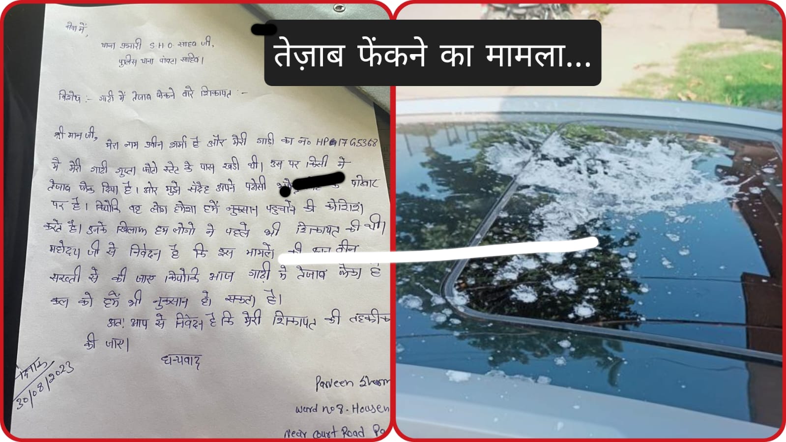 पांवटा साहिब में शहर के बीचो-बीच एसडीएम कोर्ट से महज 50 मीटर दूरी और पांवटा थाना से 100 मीटर की दूरी पर बदमाशों ने नई कार पर तेजाब डाल कर उसे नुकसान पहुंचाया है।