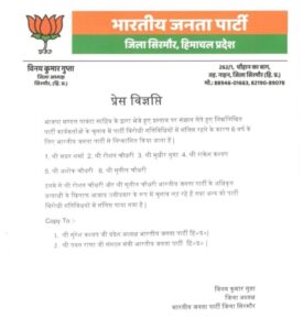 इस बाबत भाजपा जिलाध्यक्ष विनय गुप्ता द्वारा एक पत्र जारी किया गया है