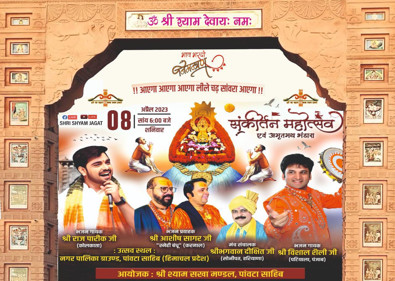 पांवटा साहिब में श्री श्याम सखा मंडल द्वारा विशाल भव्य संकीर्तन का आयोजन किया जा रहा है यह संकीर्तन 8 अप्रैल नगर परिषद मैदान में रखा गया है।