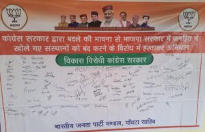 इस हस्ताक्षर अभियान में पाँवटा साहिब विधानसभा के विधायक सुखराम चौधरी, प्रदेश ओबीसी मोर्चा सचिव सुभाष चौधरी, मंडल महामंत्री हितेंद्र कुमार, ग्राम पंचायत प्रधान बलबीर धीमान, उप प्रधान अनिल कुमार, वार्ड मेंबर सुनीता देवी, मंडल उप अध्यक्ष रमेश चंद्र, जगदीश चौधरी, रामलोक चौधरी, गगन चौधरी, सुरेश कुमार,राजेश कुमार, प्रेम चौधरी व सेंकड़ों ग्राम पंचायत वासी उपस्थित रहे।