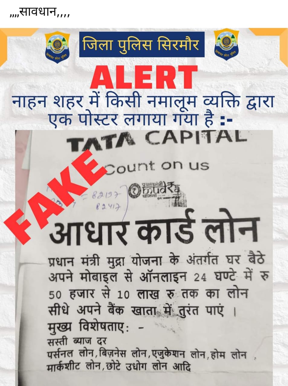 सिरमौर पुलिस द्वारा अपने सोशल मीडिया पेज पर शेयर कर लोगों को अलर्ट किया गया है कि वह नाहन और आसपास के क्षेत्रों में दीवारों पर चस्पा पोस्टर के झांसे में ना आए इन दीवारों पर प्रधानमंत्री मुद्रा लोन ऑनलाइन अकाउंट में ट्रांसफर करने जैसी झूठी बातें लिखी गई हैं अक्सर लोग इस तरह के झांसों में आ जाते हैं और अपने अकाउंट में बची कुची पूंजी भी गवां बैठते हैं।