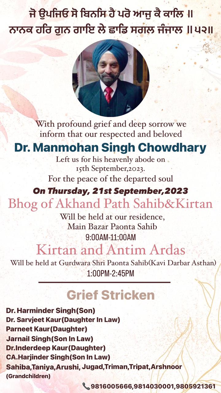 पांवटा शहर के जाने-माने डॉक्टर जिन्हें लोग प्यार से पहाड़ी डाक्टर भी कहा करते थे उनको अंतिम श्रद्धांजलि के लिए परिवार ने 21 सितंबर दिन तय किया है। उनकी आत्मिक शांति के लिए भोग अखंड पाठ साहिब और कीर्तन का आयोजन सुबह 9:00 बजे से लेकर 11:00 बजे तक मेंन बाजार में उनके घर पर रखा गया है जबकि कीर्तन और अंतिम अरदास गुरुद्वारा श्री पांवटा साहिब कवि दरबार में 1:00 बजे से लेकर 2:45 बजे तक रखा गया है।
