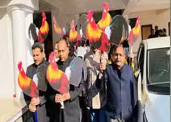 हिमाचल प्रदेश में तपोवन इस वक्त पूरी तरह से तप रहा है। कांग्रेस और भाजपा में चल जंगली मुर्गे को लेकर खींचतान जारी रही। शीत सत्र के दूसरे दिन सदन के भीतर और बाहर खूब गर्माहट बनी रही। गुरुवार को भाजपा और कांग्रेस दोनों ने ही दलों ने विधानसभा के बाहर प्रदर्शन किए। सुबह भाजपा विधायकों ने विधानसभा की कार्यवाही शुरू होने से पहले मुर्गे के कटआउट हाथ में लेकर प्रदर्शन किया, वहीं कांग्रेस विधायकों ने भोजनावकाश के दौरान सदन के बाहर संविधान निर्माता भीमराम आंबेडकर के चित्र लेकर धरना दिया।