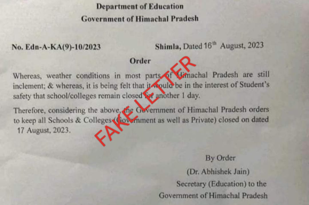 हिमाचल प्रदेश में स्कूल कॉलेज बंद रखने को लेकर एक फेक लेटर वायरल हो रहा है जिसके कारण काफी परेशानी और असमंजस्य में लोग इस लेटर को वायरल करते नजर आए। सिर्फ इतना ही नहीं सरकारी ग्रुप में भी यह पत्र वायरल किया गया और बाद में हटा दिया गया।