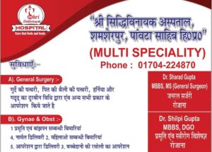 Himachal Pradesh…. हिमाचल प्रदेश पांवटा साहिब के स्वास्थ्य सेवाओं में एक अलग मुकाम हासिल कर चुके श्री सिद्धिविनायक हॉस्पिटल के डायरेक्टर और शहर के एकमात्र सर्जन डॉक्टर शरद गुप्ता ने प्रदेश वासियों को स्वतंत्रता दिवस पर शुभकामनाएं देते हुए कहा कि सभी लोग सुरक्षित रहें स्वस्थ रहें ऐसी वह ईश्वर से कामना करते हैं उन्होंने कहा कि अपने आसपास सफाई बनाए रखें यह भी देश के प्रति जिम्मेदारी है। Dr. Sharad Gupta MBBS , MS , FMAS (GOLD MEDALIST)(GEN. SURGEON)