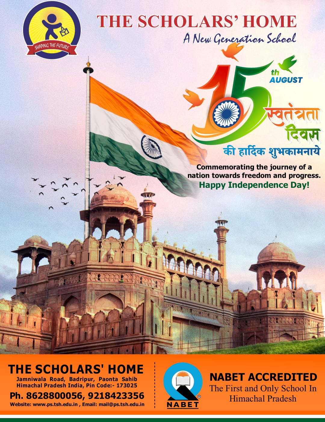 THE SCHOLARS HOME स्कूल की ओर से हिमाचल प्रदेश और पांवटा साहिब वासियों को स्वतंत्रता दिवस पर हार्दिक शुभकामनाएं, DIRECTOR NARENDRA PAL SINGH NARANG ने कहा कि स्वतंत्रता दिवस पर शहीदों और स्वतंत्रता सेनानियों को समर्पित यह दिन हम सभी को गर्व का अहसास करवाता है देश की स्वतंत्रता के लिए हजारों कुर्बानियां दी गई और आज भी इसकी स्वतंत्रता बरकरार रखने के लिए सरहदों पर सिपाही सर्वोच्च बलिदान करते हैं हम उन सभी के लिए जीवन अंत तक ऋणी रहेंगे।