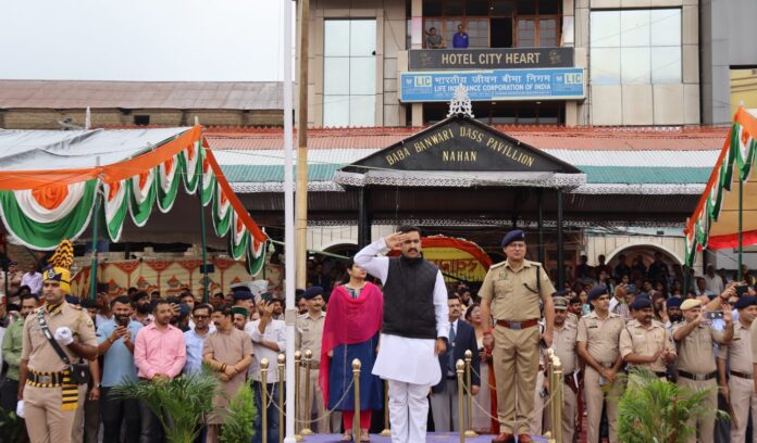 नाहन 15 अगस्त। 79 वें स्वतंत्रता दिवस के जिला स्तरीय समारोह में लोक निर्माण एवं शहरी विकास मंत्री विक्रमादित्य सिंह ने सिरमौर जिला मुख्यालय नाहन चौगान में ध्वजारोहण कर जिला वासियों को स्वतंत्रता दिवस की शुभकामनाएं दी। उन्होंने पुलिस, होम गार्ड, एनसीसी, एनएसएस व स्काउट एवं गाइड की टुकड़ियों द्वारा प्रस्तुत आकर्षक मार्च पास्ट की सलामी ली। इससे पूर्व उन्होंने डॉ. वाई.एस. परमार की प्रतिमा पर पुष्पांजलि अर्पित की तथा शहीद चौक पर उन्होंने शहीदों को भी श्रद्धा सुमन अर्पित किये।