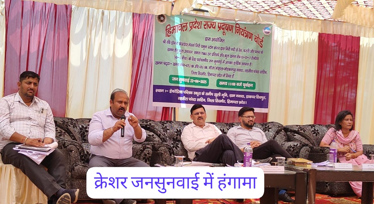 पांवटा साहिब की नवादा पंचायत में गिरी यमुना स्टोन क्रशर को लेकर पर्यावरण जनसुनवाई रखी गई थी। इस दौरान ग्रामीणों ने प्रदूषण नियंत्रण बोर्ड अधिकारियों सहित विभागों को जमकर आड़े हाथों लिया ओर क्रेशर नहीं लगाने की रिपोर्ट दर्ज की गई।