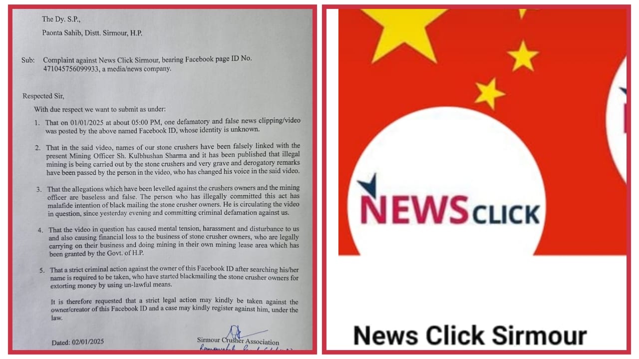 सिरमौर क्रशर एसोसिएशन की ओर से पुलिस को शिकायत सौंप दी गई है जिसमें उनके साथ-साथ डिपार्टमेंट को भी बदनाम करने की कोशिश की गई है। एक फेक फेसबुक पेज बनाकर एक पुरानी वीडियो चलाई गई। जिसमें विभाग पर कईं गंभीर आरोप लगाए गए। बता दे की फेक न्यूज़ बनाकर फेसबुक पर डालने वालों का जल्दी खुलासा होगा।
