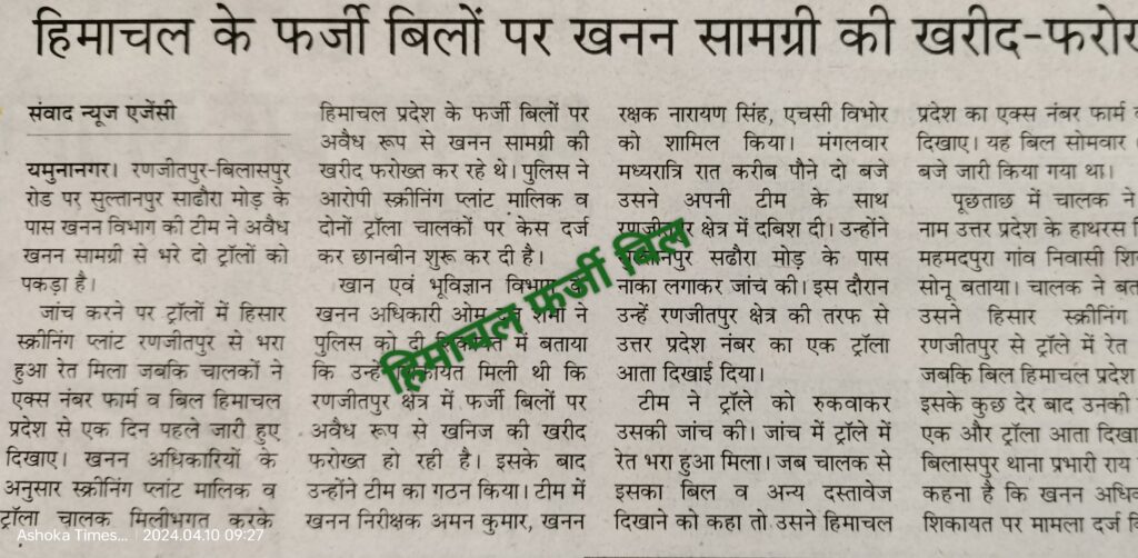 हरियाणा के यमुनानगर में लगातार हिमाचल प्रदेश के फर्जी बिलों पर खनन सामग्री की तस्करी को लेकर खबरें प्रकाशित की जा रही है बता दें कि यह खनन सामग्री कथिततौर पर पांवटा साहिब के रामपुर घाट से तस्करी हो रही है!
