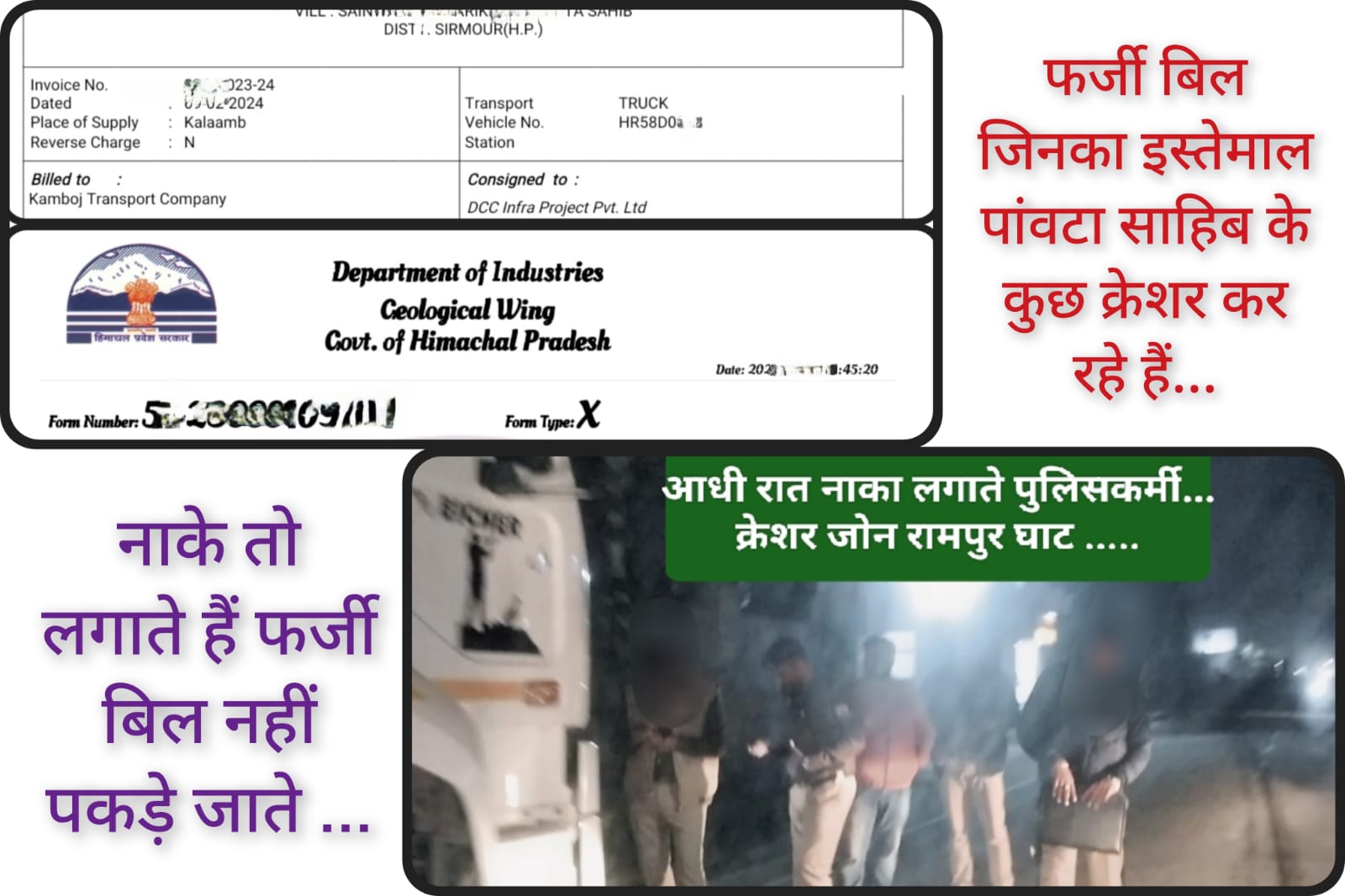 दरअसल पांवटा साहिब रामपुर घाट से रात के समय लाखों रुपए कि खनन सामग्री फर्जी बिलों पर तस्करी होती है खनन सामग्री रामपुर घाट मतरालिया क्रेशर से भरी जाती है और बिल सैनवाला और अन्य क्रेशरों के लगाए जाते हैं और यह बिल कंप्यूटर में चढ़ाकर छोड़ दिए जाते हैं अगर रास्ते में पुलिस वन विभाग या खनन अधिकारी इन ट्रैकों को पकड़ लेता है तो ड्राइवर द्वारा फोन पर सूचित कर तुरंत कंप्यूटर द्वारा बिलों को एंटर कर दिया जाता है और अगर कोई नहीं पकड़ता है तो इन बिलों को दोबारा से खनन सामग्री के लिए इस्तेमाल किया जाता है यह सभी जानकारी क्रेशरों पर काम करने वाले सूत्रों के हवाले से दी जा रही है।