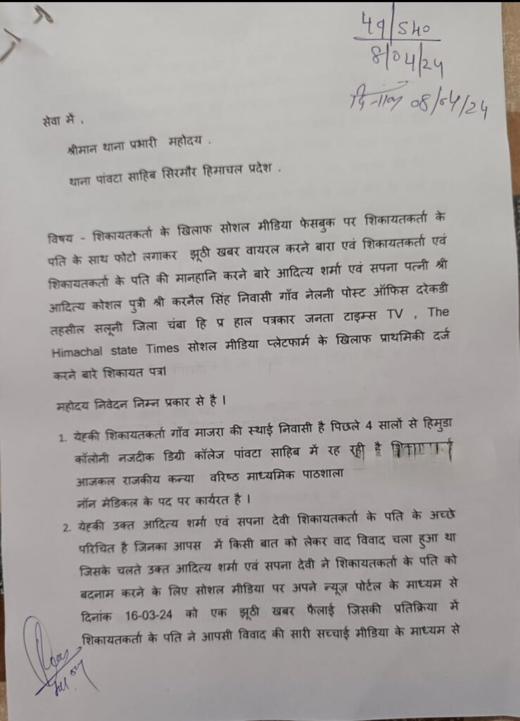कथित महिला पत्रकार ने पुलिस के अधिकारियों का भी झूठा ब्यान अपनी सोशल मीडिया  फेक वैब पर डाल दिया जिसको लेकर पुलिस अलग से रिपोर्ट दर्ज कर चुकी है। पांवटा पुलिस थाना प्रभारी अशोक चौहान ने मीडिया कर्मियों को बताया कि उन्होंने किसी सोशल मीडिया पर कोई बयान जारी नहीं किया है यह बिल्कुल गलत बयान उनकी ओर से प्रकाशित किया गया है इस पर भी पुलिस कार्रवाई कर रही है। फिलहाल कोई मामला दर्ज नहीं किया गया है।