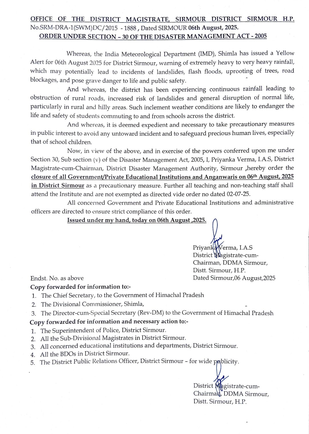 अब, उपरोक्त के मद्देनजर, और आपदा प्रबंधन अधिनियम, 2005 की धारा 30, उपधारा (v) के तहत मुझे प्रदत्त शक्तियों का प्रयोग करते हुए, मैं, प्रियंका वर्मा, भा.प्र.से., जिला मजिस्ट्रेट-सह-अध्यक्ष, जिला आपदा प्रबंधन प्राधिकरण, सिरमौर, एतद्द्वारा जिला सिरमौर में 06 अगस्त, 2025 को एहतियात के तौर पर सभी सरकारी/निजी शैक्षणिक संस्थानों और आंगनबाड़ियों को बंद करने का आदेश देती हूँ। इसके अतिरिक्त, सभी शिक्षण और गैर-शिक्षण कर्मचारी संस्थान में उपस्थित रहेंगे और उन्हें आदेश संख्या दिनांक 02-07-25 के अनुसार छूट नहीं दी जाएगी।